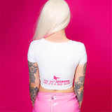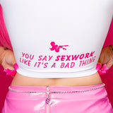 This super-soft crop top has a bodycon fit and a cropped length with "The Slut Life" printed on the front and "You say sexwork like it's a bad thing" printed on the back - cause we are ending stigma bitchez.