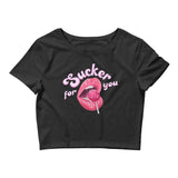 Luscious lips and lollipops show Daddy how much you love him with the sexy "Sucker For You" belly shirt. This amazing top is tight-fitting but still incredibly comfortable. It hits just above the navel, letting you show off that pierced bellybutton or sexy tattoo.